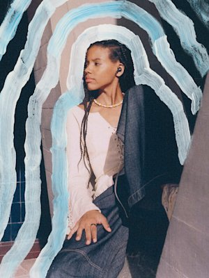 A young man in a Marshall leather jacket standing in front of a red wall.