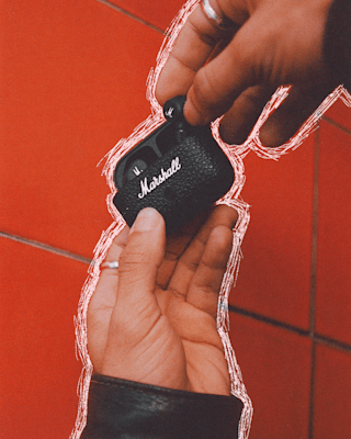 Hand holding the Marshall Motif II A.N.C. in-ear headphones